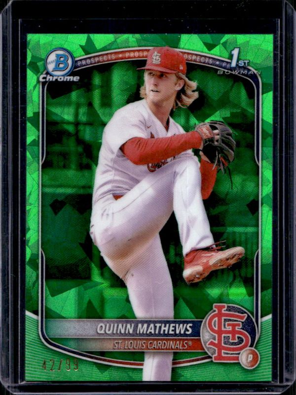 The Quinn Mathews 2025 Bowman Sapphire Edition #BCP-25 Chrome Prospects - Green Refractor /99 card is 1 of 16 Quinn Mathews' card variations in the 2025 Bowman Sapphire Edition set being tracked by Sports Card Investor, including Chrome Prospects, Chrome Prospect Autographs /199, Chrome Prospect Autographs - Green Refractor /99, Chrome Prospects - Yellow Refractor /75, and Chrome Prospect Autographs - Gold Refractor /50.