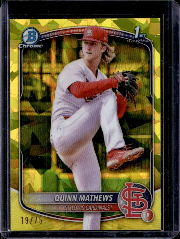 The Quinn Mathews 2025 Bowman Sapphire Edition #BCP-25 Chrome Prospects - Yellow Refractor /75 card is 1 of 16 Quinn Mathews' card variations in the 2025 Bowman Sapphire Edition set being tracked by Sports Card Investor, including Chrome Prospects, Chrome Prospect Autographs /199, Chrome Prospect Autographs - Green Refractor /99, Chrome Prospects - Green Refractor /99, and Chrome Prospect Autographs - Gold Refractor /50.