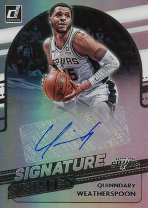 Quinndary Weatherspoon's Basketball cards are available in at least 23 sets. Quinndary Weatherspoon's biggest 7-day price movers are 2021 Donruss #SS-QWS Signatures Series, 2019 Donruss #243 Press Proof Blue Laser /49, and 2019 Donruss #243 Rated Rookies Signatures - Press Proof Gold Laser /10.