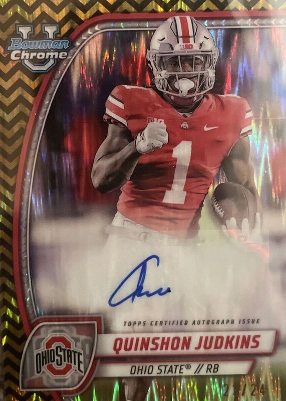 This card is 1 of 14 Quinshon Judkins' card variations in the 2024 Bowman Chrome University set being tracked by Sports Card Investor, including Prospect Auto, Prospect Auto - Stealth Refractor, Prospect Auto - Refractor /299, Prospect Auto - Fuchsia Refractor /150, and Prospect Auto - Green Refractor /99.