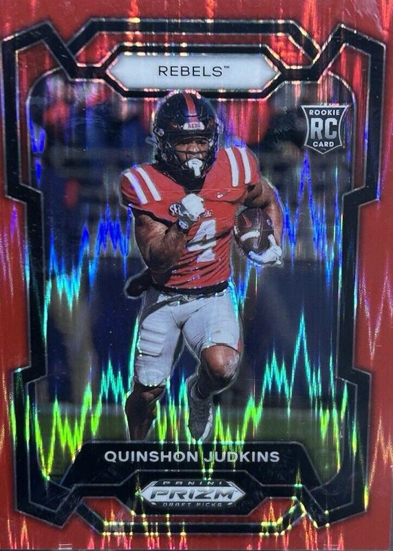This card is 1 of 57 Quinshon Judkins' card variations in the 2024 Prizm Draft Picks set being tracked by Sports Card Investor, including Base, Green, Purple Wave, Red Ice, and Ruby Wave.