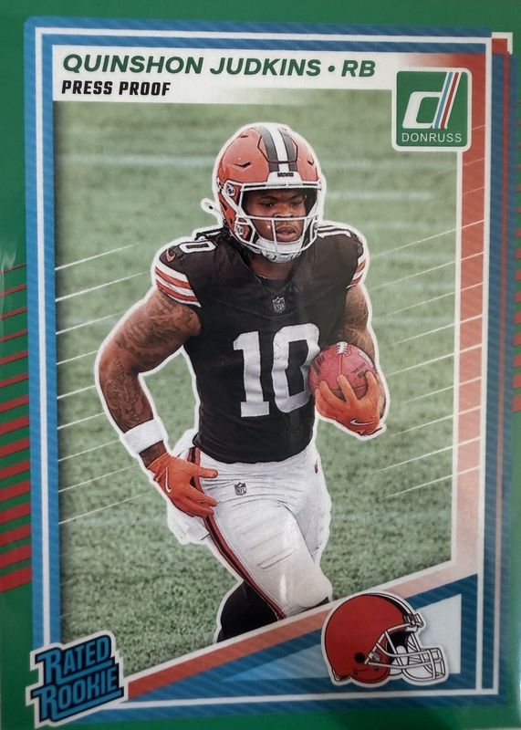 The Quinshon Judkins 2025 Donruss #330 Press Proof Green Rookie card in Raw condition has moved up $0.26 (+26.3%) in the last 30 days and was last sold for $1.25 .