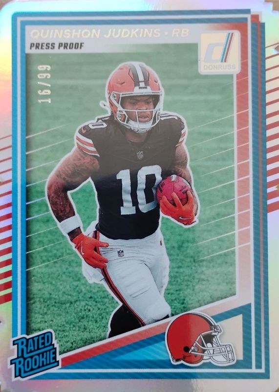 The Quinshon Judkins 2025 Donruss #330 Press Proof Silver Die-Cut /99 Rookie card in Raw condition has not changed in price in the last 30 days and was last sold for $16.50 .
