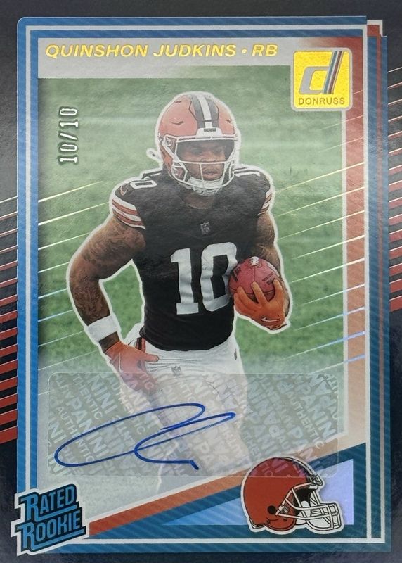 The Quinshon Judkins 2025 Donruss #330 Rated Rookie Autographs - Black /10 card in Raw condition has not changed in price in the last 30 days and was last sold for $555.00 .