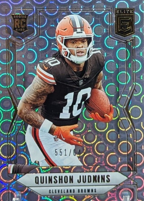 The Quinshon Judkins 2025 Elite #121 Lavender Pyramids /649 Rookie card in Raw condition has moved down -$0.50 (-6.7%) in the last 30 days and was last sold for $7.00 .