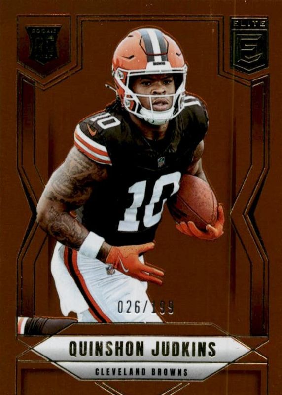 The Quinshon Judkins 2025 Elite #121 Orange /199 Rookie card in Raw condition has moved down -$0.99 (-11.0%) in the last 30 days and was last sold for $8.00 .