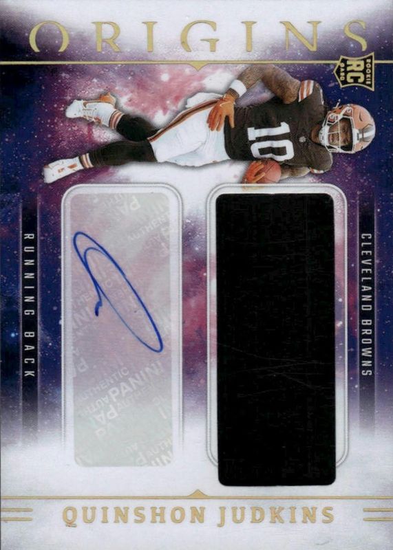 The Quinshon Judkins 2025 Origins #RJJ-QJS Rookie Jumbo Patch Autographs card in Raw condition has moved down -$21.34 (-41.6%) in the last 30 days and was last sold for $30.00 .