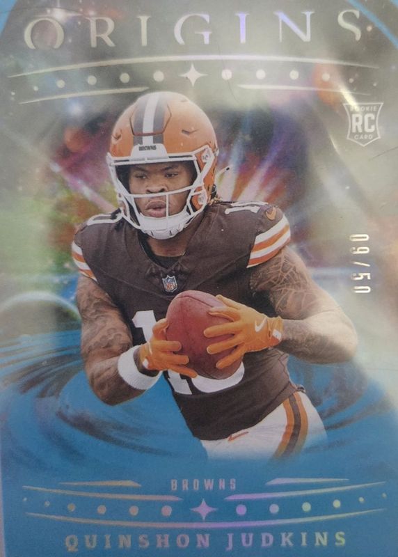 The Quinshon Judkins 2025 Origins #131 Turquoise /50 Rookie card in Raw condition has not changed in price in the last 30 days and was last sold for $8.50 .