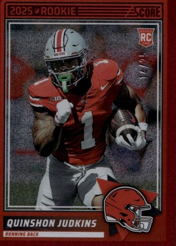 The Quinshon Judkins 2025 Score #38 Dots Red /25 Rookie card in Raw condition has not changed in price in the last 30 days and was last sold for $23.76 .