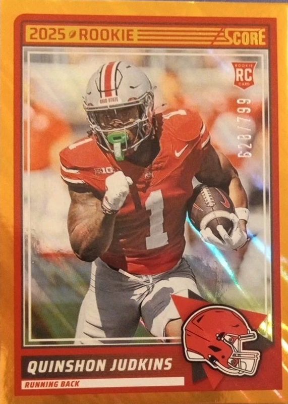 The Quinshon Judkins 2025 Score #38 Lava /799 Rookie card in Raw condition has not changed in price in the last 30 days and was last sold for $10.00 .