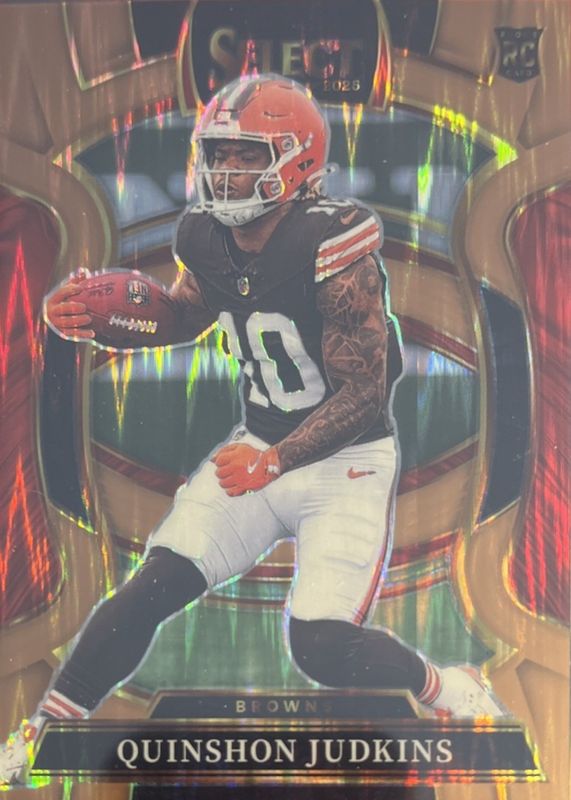 The Quinshon Judkins 2025 Select #55 Concourse Copper Shock /899 Rookie card in Raw condition has moved up $0.03 (+0.9%) in the last 30 days and was last sold for $3.28 .