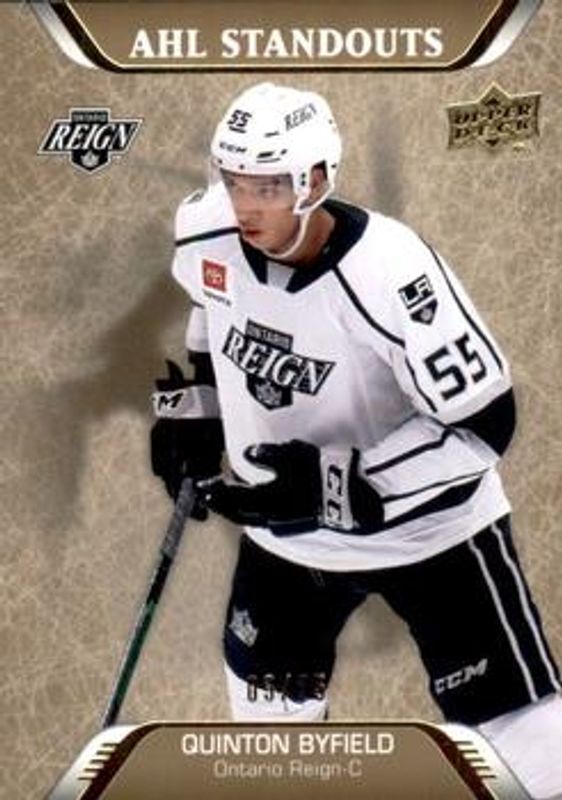 The Quinton Byfield 2020 Upper Deck AHL #234 Gold /25 card is 1 of 12 Quinton Byfield's card variations in the 2020 Upper Deck AHL set being tracked by Sports Card Investor, including #151 Base, #234 Base, #234 Red, #151 UD Exclusives /100, and #151 UD High Gloss /10.