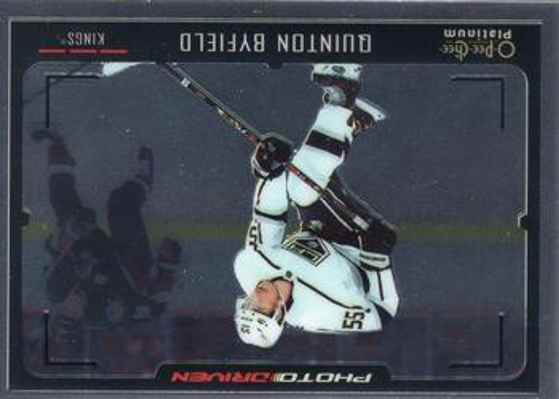 The Quinton Byfield 2021 O-Pee-Chee Platinum #PD-13 Photo Driven Rookie card is 1 of 48 Quinton Byfield's card variations in the 2021 O-Pee-Chee Platinum set being tracked by Sports Card Investor, including Base, Black Shield (Marquee Rookies), Blue Surge, Matte Pink, and Neon Yellow Surge.