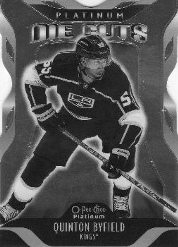 The Quinton Byfield 2021 O-Pee-Chee Platinum #DC-23 Platinum Die Cuts Rookie card is 1 of 48 Quinton Byfield's card variations in the 2021 O-Pee-Chee Platinum set being tracked by Sports Card Investor, including Base, Black Shield (Marquee Rookies), Blue Surge, Matte Pink, and Neon Yellow Surge.