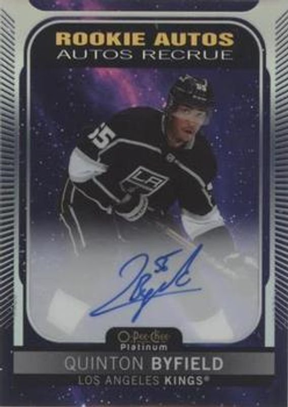 The Quinton Byfield 2021 O-Pee-Chee Platinum #R-QB Rookie Autographs Cosmic card is 1 of 48 Quinton Byfield's card variations in the 2021 O-Pee-Chee Platinum set being tracked by Sports Card Investor, including Base, Black Shield (Marquee Rookies), Blue Surge, Matte Pink, and Neon Yellow Surge.