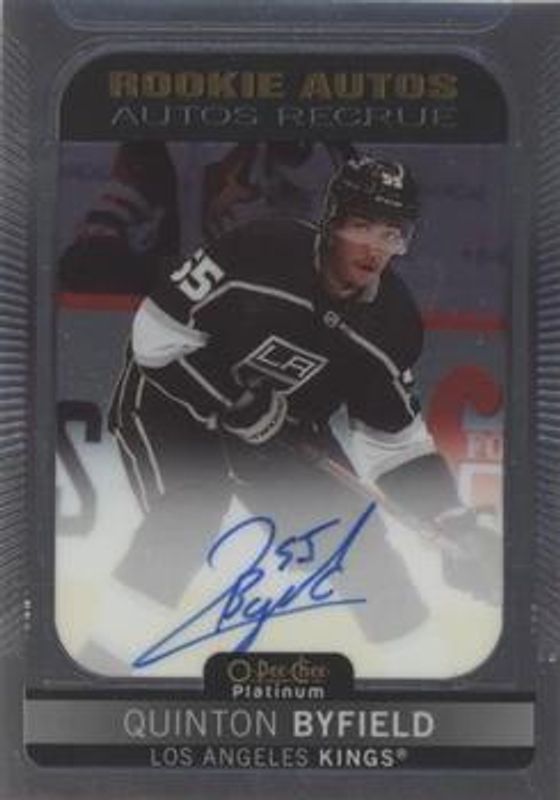 The Quinton Byfield 2021 O-Pee-Chee Platinum #R-QB Rookie Autographs card is 1 of 48 Quinton Byfield's card variations in the 2021 O-Pee-Chee Platinum set being tracked by Sports Card Investor, including Base, Black Shield (Marquee Rookies), Blue Surge, Matte Pink, and Neon Yellow Surge.
