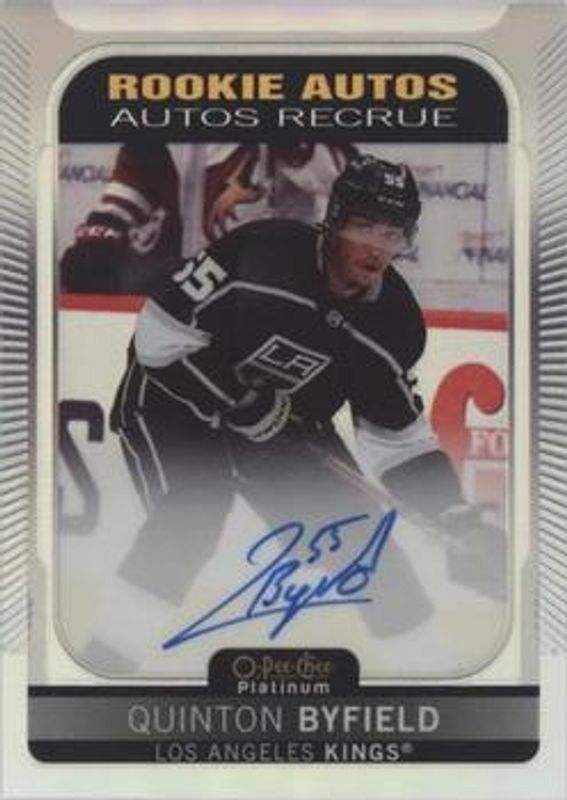 The Quinton Byfield 2021 O-Pee-Chee Platinum #R-QB Rookie Autographs Rainbow card is 1 of 48 Quinton Byfield's card variations in the 2021 O-Pee-Chee Platinum set being tracked by Sports Card Investor, including Base, Black Shield (Marquee Rookies), Blue Surge, Matte Pink, and Neon Yellow Surge.