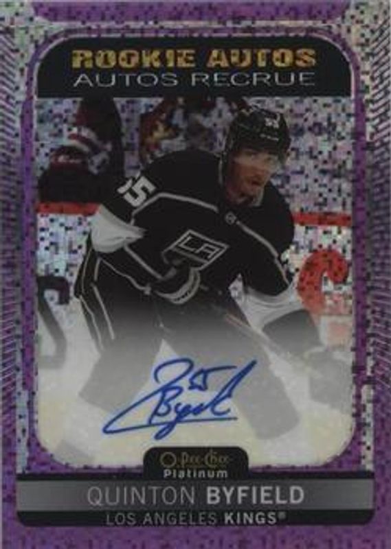 The Quinton Byfield 2021 O-Pee-Chee Platinum #R-QB Rookie Autographs Violet Pixels card is 1 of 48 Quinton Byfield's card variations in the 2021 O-Pee-Chee Platinum set being tracked by Sports Card Investor, including Base, Black Shield (Marquee Rookies), Blue Surge, Matte Pink, and Neon Yellow Surge.