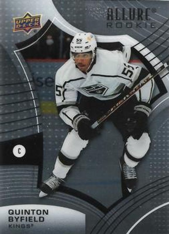 The Quinton Byfield 2021 Upper Deck Allure #150 Base Rookie card is 1 of 54 Quinton Byfield's card variations in the 2021 Upper Deck Allure set being tracked by Sports Card Investor, including 1917 Shield, 2005 Shield, Black Rainbow, Blue China, and Leopard.