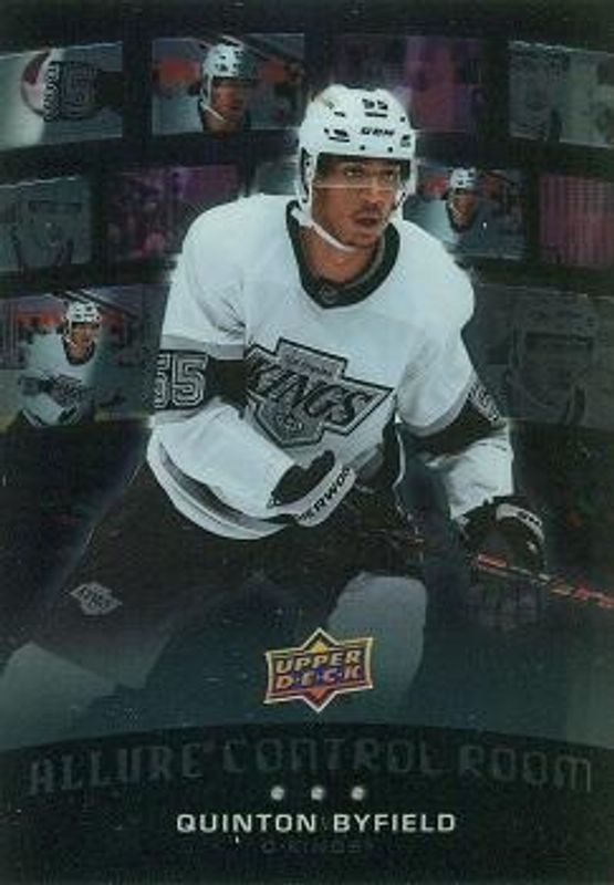 The Quinton Byfield 2021 Upper Deck Allure #CR-12 Control Room Rookie card is 1 of 54 Quinton Byfield's card variations in the 2021 Upper Deck Allure set being tracked by Sports Card Investor, including Base, 1917 Shield, 2005 Shield, Black Rainbow, and Blue China.