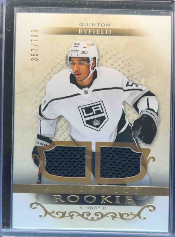 The Quinton Byfield 2021 Upper Deck Artifacts #161 Material - Gold /199 Rookie card is 1 of 41 Quinton Byfield's card variations in the 2021 Upper Deck Artifacts set being tracked by Sports Card Investor, including Base /999, Neon Green, Rose Gold, Turquoise, and Ruby /499.