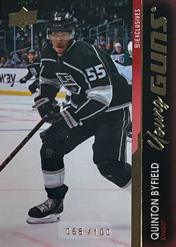 The Quinton Byfield 2021 Upper Deck #488 Young Guns - UD Exclusives /100 Rookie card in Raw condition has not changed in price in the last 30 days and was last sold for $278.19 .