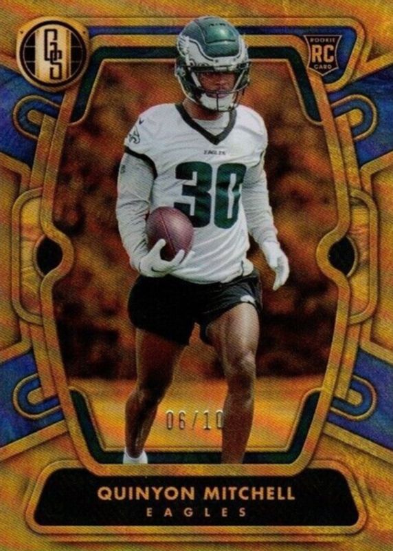 This card is 1 of 9 Quinyon Mitchell's card variations in the 2024 Gold Standard set being tracked by Sports Card Investor, including Base /99, Platinum /75, White Gold /65, Citrine /40, and Rose Gold /40.