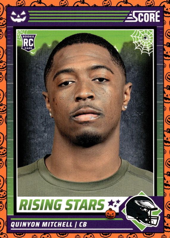This card is 1 of 3 Quinyon Mitchell's card variations in the 2024 Score-A-Treat set being tracked by Sports Card Investor, including Rising Stars - Green Bats, and Rising Stars - Trick or Treat /99.