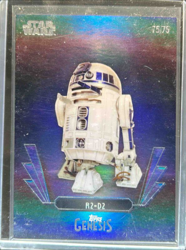 The R2-D2 2025 Topps Disney Genesis #10 Blue Foil /75 card is 1 of 5 R2-D2's card variations in the 2025 Topps Disney Genesis set being tracked by Sports Card Investor, including Gold Foil /50, Orange Foil /25, Purple Foil /15, and Red Shimmer /5.
