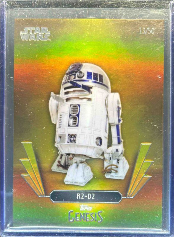 The R2-D2 2025 Topps Disney Genesis #10 Gold Foil /50 card is 1 of 5 R2-D2's card variations in the 2025 Topps Disney Genesis set being tracked by Sports Card Investor, including Blue Foil /75, Orange Foil /25, Purple Foil /15, and Red Shimmer /5.