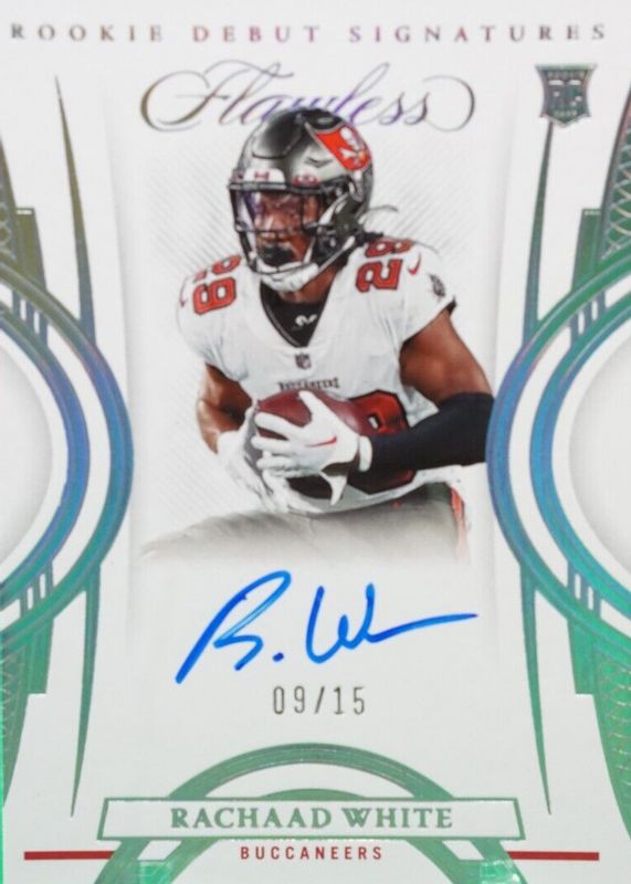 This card is 1 of 12 Rachaad White's card variations in the 2022 Flawless set being tracked by Sports Card Investor, including Rookie Debut Signatures (/20), Rookie Debut Signatures - Ruby (/10), Rookie Patch Auto /25, Rookie Patch Auto - Silver /20, and Rookie Patch Auto - Ruby /15.