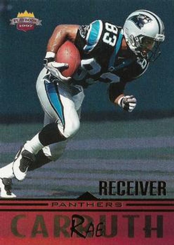 The Rae Carruth 1997 Score Board Playbook #61 Base Rookie card is 1 of 2 Rae Carruth's card variations in the 1997 Score Board Playbook set being tracked by Sports Card Investor, including Title Quest.