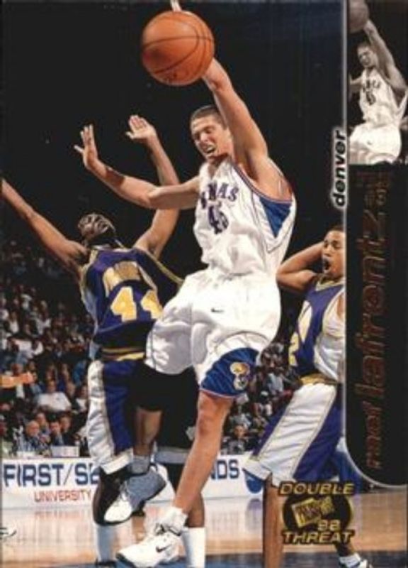 The Raef LaFrentz 1998 Press Pass Double Threat #3 Base Rookie card is 1 of 9 Raef LaFrentz's card variations in the 1998 Press Pass Double Threat set being tracked by Sports Card Investor, including Alley Oop, Torquers, Jackpot, Retros, and Rookie Jerseys.