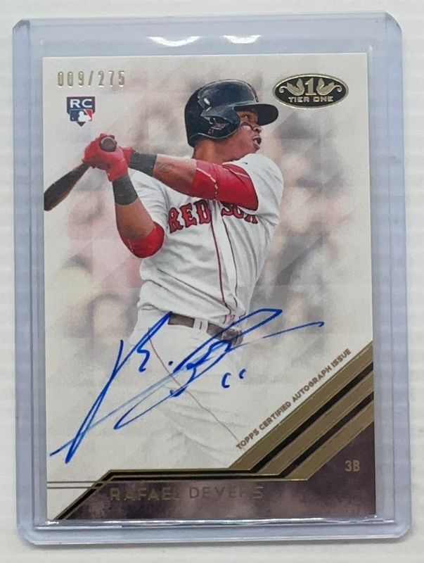The Rafael Devers 2018 Topps Tier One #BA-RDE Break Out Autographs /275 Rookie card is 1 of 24 Rafael Devers' card variations in the 2018 Topps Tier One set being tracked by Sports Card Investor, including Tier One Relics /335, Break Out Autographs /275, Tier One Talent Autographs /80, Autographed Tier One Relics /35, and Autographed Tier One Relics Dual Patch /25.