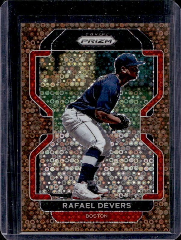 The Rafael Devers 2022 Prizm #134 Bronze Donut Circles /40 card is 1 of 82 Rafael Devers' card variations in the 2022 Prizm set being tracked by Sports Card Investor, including Base, Blue, Blue Velocity, Carolina Blue, and Cosmic Haze.