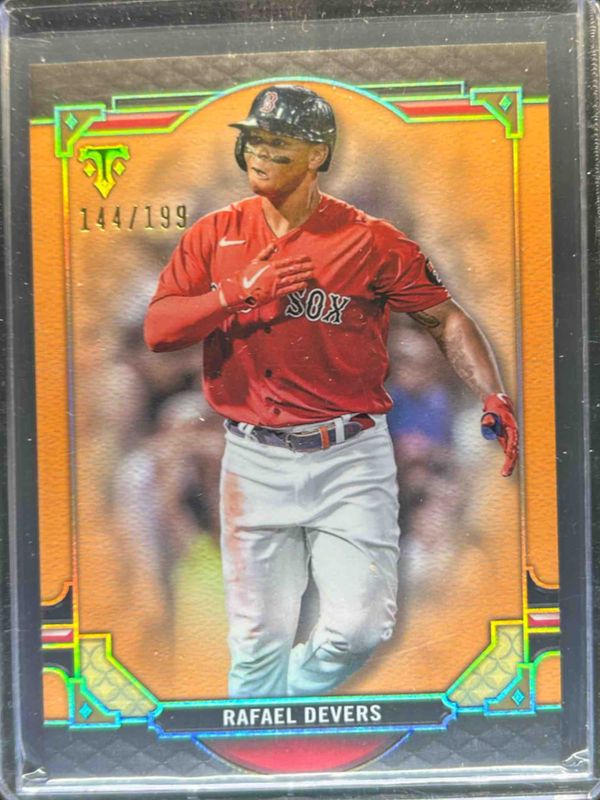 The Rafael Devers 2022 Topps Triple Threads #75 Amber /199 card is 1 of 119 Rafael Devers' card variations in the 2022 Topps Triple Threads set being tracked by Sports Card Investor, including Base, Amethyst /299, Emerald /259, Aquamarine /150, and Tourmaline /125.