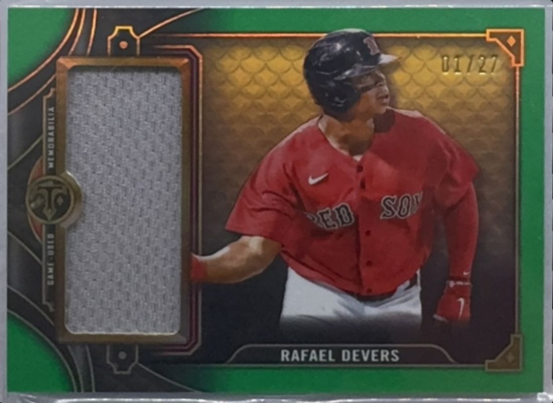 The Rafael Devers 2022 Topps Triple Threads #SJR1-RD1 Single Jumbo Relics - Emerald /27 card is 1 of 119 Rafael Devers' card variations in the 2022 Topps Triple Threads set being tracked by Sports Card Investor, including Base, Amethyst /299, Emerald /259, Amber /199, and Aquamarine /150.