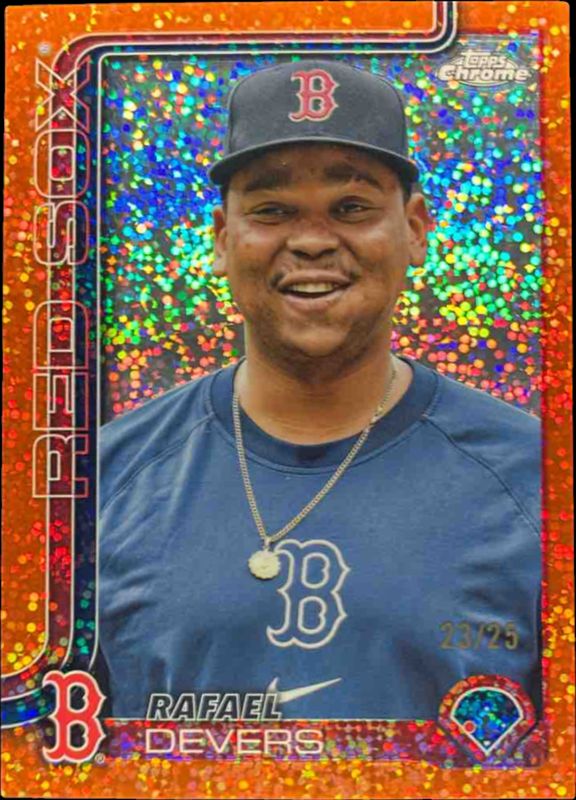 The Rafael Devers 2025 Topps Chrome #127 Base Image Variation - Orange Speckle Refractor /25 card is 1 of 80 Rafael Devers' card variations in the 2025 Topps Chrome set being tracked by Sports Card Investor, including Base, Geometric Refractor, Image Variation, Lightboard Logo Variation, and Negative Refractor.