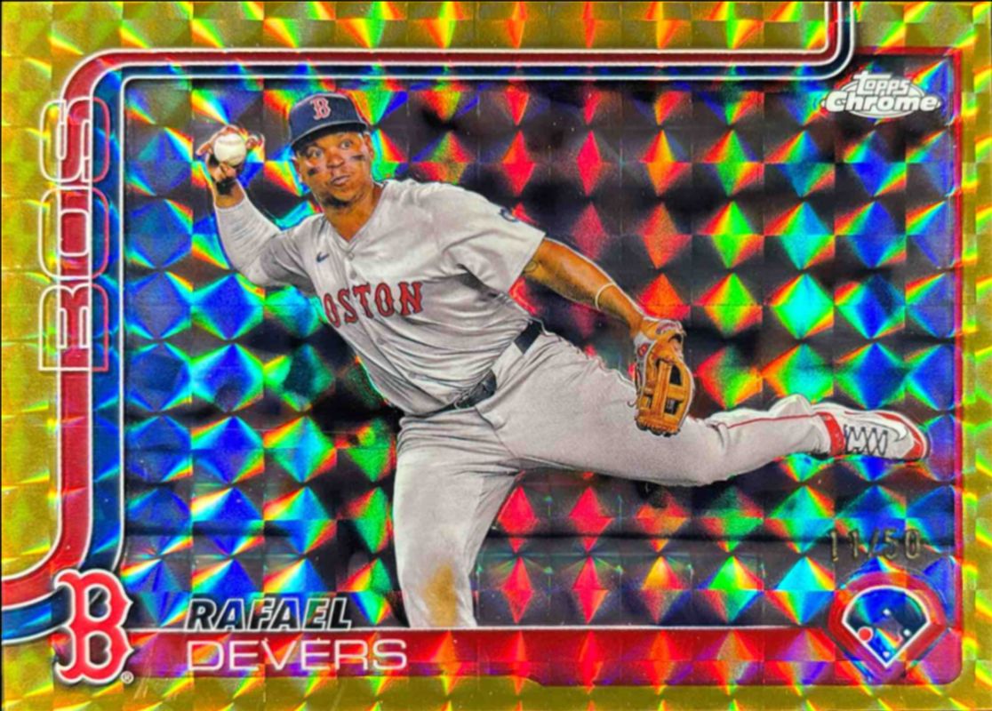The Rafael Devers 2025 Topps Chrome #127 Gold Geometric Refractor /50 card is 1 of 80 Rafael Devers' card variations in the 2025 Topps Chrome set being tracked by Sports Card Investor, including Base, Geometric Refractor, Image Variation, Lightboard Logo Variation, and Negative Refractor.