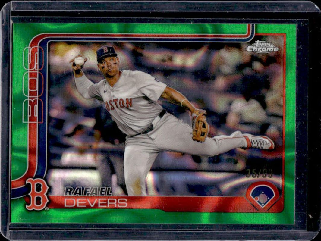 The Rafael Devers 2025 Topps Chrome #127 Green Lava Refractor /99 card is 1 of 80 Rafael Devers' card variations in the 2025 Topps Chrome set being tracked by Sports Card Investor, including Base, Geometric Refractor, Image Variation, Lightboard Logo Variation, and Negative Refractor.