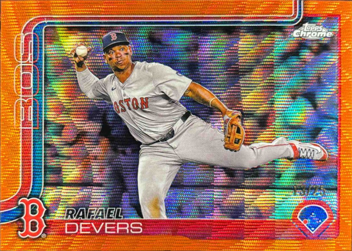 The Rafael Devers 2025 Topps Chrome #127 Orange Wave Refractor /25 card is 1 of 80 Rafael Devers' card variations in the 2025 Topps Chrome set being tracked by Sports Card Investor, including Base, Geometric Refractor, Image Variation, Lightboard Logo Variation, and Negative Refractor.