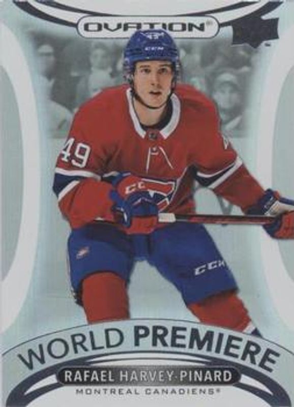 The Rafael Harvey-Pinard 2021 Upper Deck Ovation #WP-6 World Premiere Rookie card is 1 of 13 Rafael Harvey-Pinard's card variations in the 2021 Upper Deck Ovation set being tracked by Sports Card Investor, including World Premiere - Gold /299, World Premiere - Red /199, World Premiere - Blue /99, World Premiere - Purple /65, and World Premiere - Pink /49.