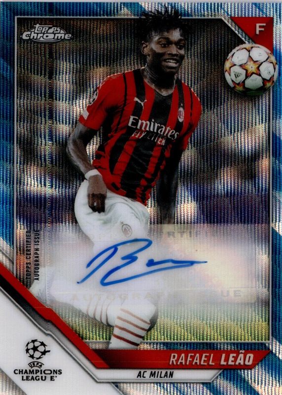 The Rafael Leao 2021 Topps Chrome UEFA Champions League #CA-LE Autographs - Blue Wave Refractor /75 card in Raw condition has not changed in price in the last 30 days and was last sold for $33.00 .