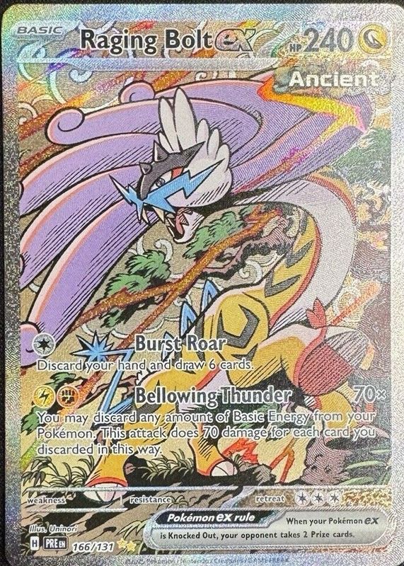 The Raging Bolt ex 2025 Scarlet & Violet: Prismatic Evolutions #166/131 Special Illustration Rare card in Raw TCG (Near Mint) condition has moved up $15.00 (+34.9%) in the last 30 days and was last sold for $58.00 .