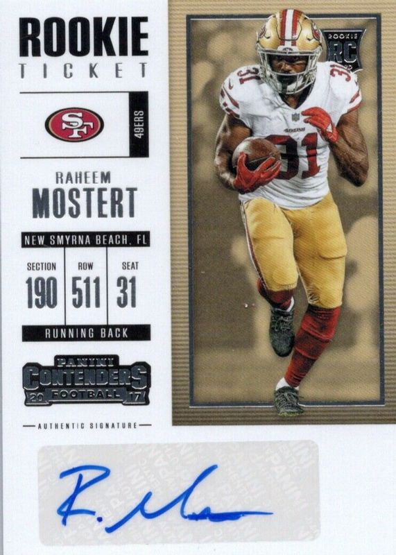The Raheem Mostert 2017 Contenders #297 Rookie Ticket Auto card in Raw condition has moved down -$18.00 (-72.0%) in the last 30 days and was last sold for $7.00 .