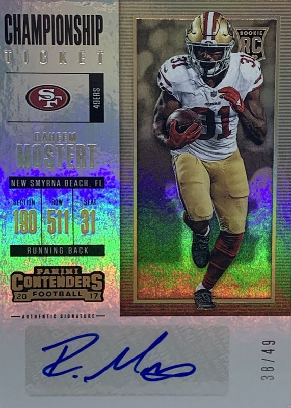 The Raheem Mostert 2017 Contenders #297 Rookie Ticket Auto - Championship Ticket (/49) card in Raw condition has not changed in price in the last 30 days and was last sold for $51.00 .