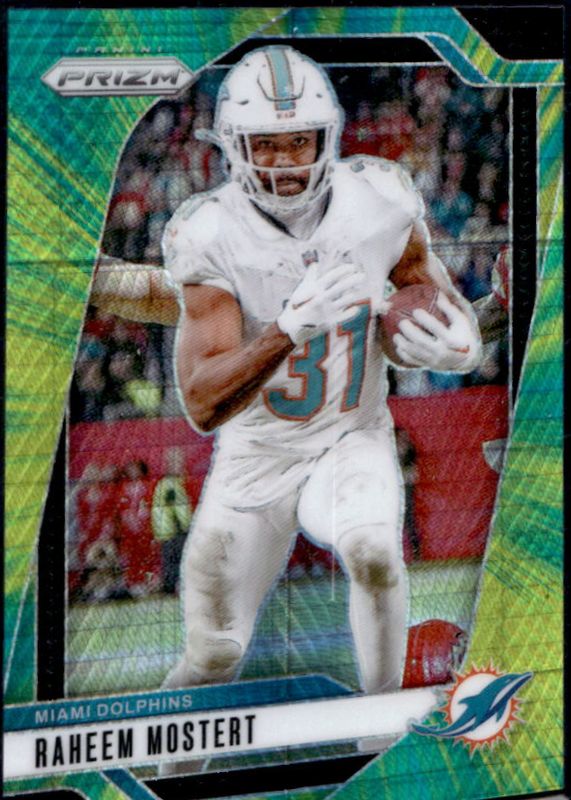 The Raheem Mostert 2024 Prizm #179 Hyper /180 card is 1 of 83 Raheem Mostert's card variations in the 2024 Prizm set being tracked by Sports Card Investor, including Base, Choice Blue Yellow Green, Choice Silver, Disco, and Green.