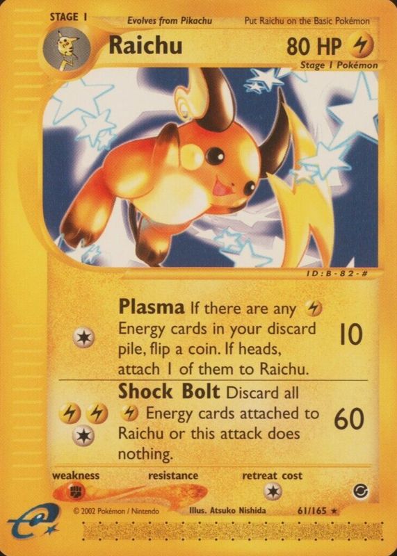 The Raichu 2002 Expedition #061/165 Base card in Raw TCG (Near Mint) condition has moved down -$1.90 (-19.2%) in the last 30 days and was last sold for $8.00 .