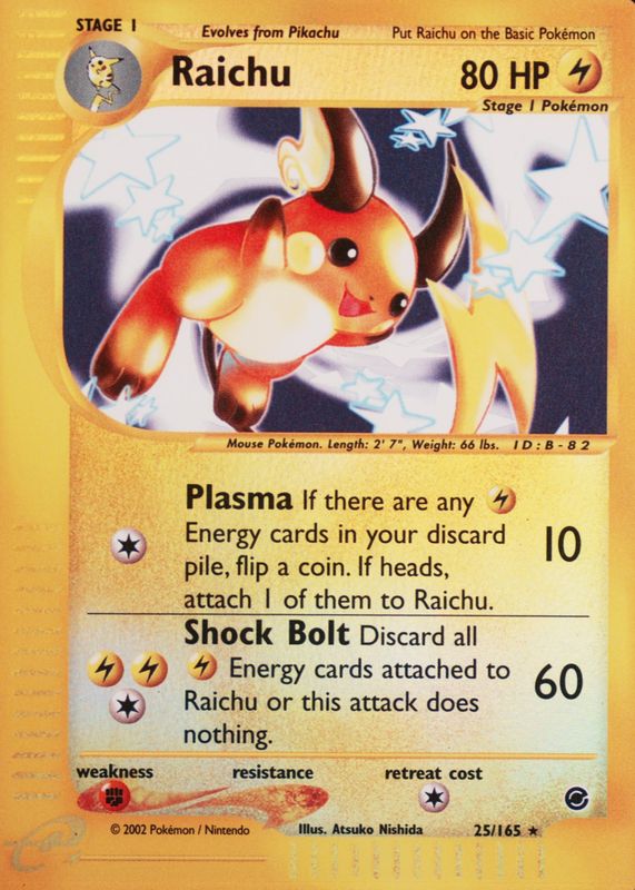The Raichu 2002 Expedition #025/165 Reverse Holo card in Raw TCG (Near Mint) condition has not changed in price in the last 30 days and was last sold for $47.40 .