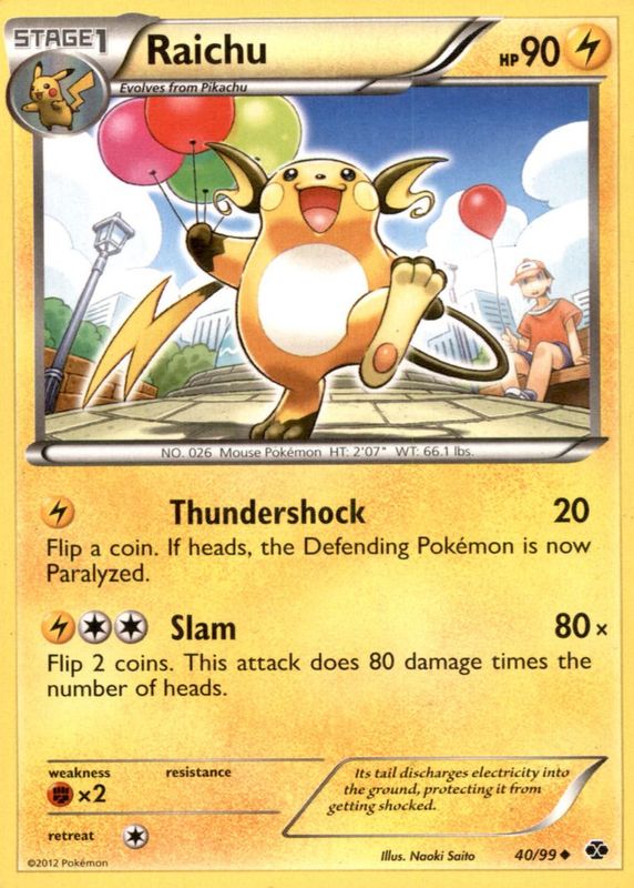 The Raichu 2012 Black & White: Next Destinies #40/99 Base card in Raw TCG (Lightly Played) condition has moved down -$5.51 (-73.5%) in the last 30 days and was last sold for $1.99 .